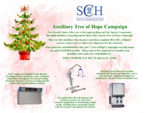 The Sparta Community Hospital Auxiliary is gearing up for their Annual Tree of Hope Campaign. This year, the Auxiliary has chosen to purchase a patient floor lift, hospital grade blanket warming cabinet, and a new ice and water dispenser for the cafeteria.